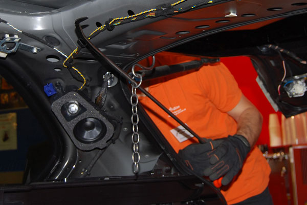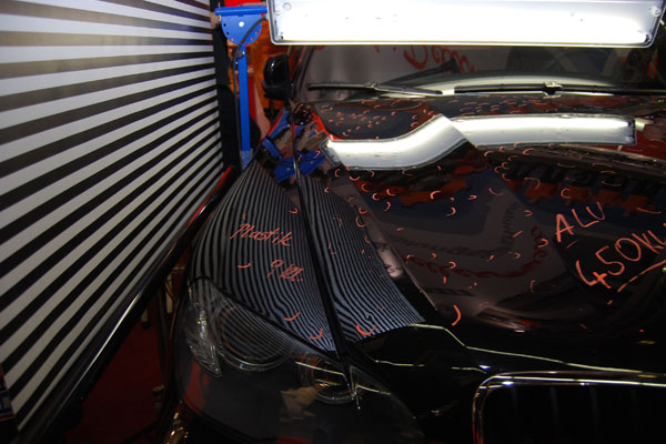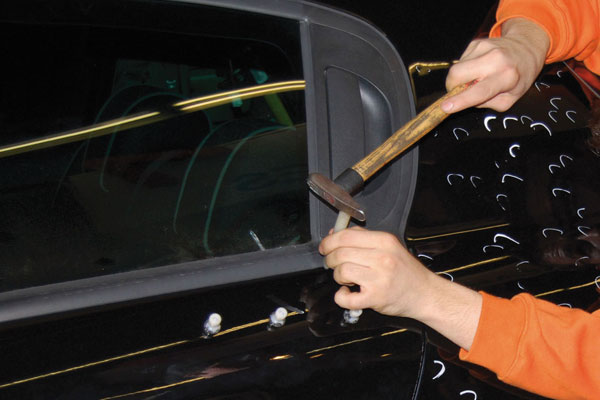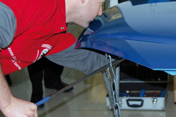 Es gibt Fälle, in denen der Dellentechniker schwer an die Reparaturstelle mit dem Hebel hinkommt. Hier wird die Delle „herausgezogen”. Der Dellentechniker bringt einen Adapter mit Spezialkleber auf das lackierte Blech an und zieht ihn mit Hilfe von Spezialwerkzeug. Diese Methode nennt man Klebetechnik.