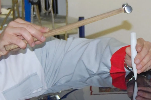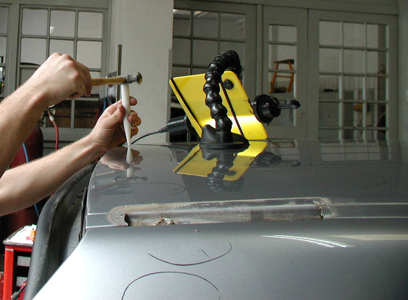 Je nach Art der Delle werden unterschiedliche Ausbeulhebel verwendet. Im Sichtbereich wird oft mit speziellen Kunststoffaufsätzen für die Drückerhebel gearbeitet, um den Lack nicht zu beschädigen. Die Fixierlampe wirft Reflexionslinien auf den Lack. Die entstehenden Reflexionsbilder helfen, die Größe der Beschädigungen zu beurteilen, die zu bearbeitende Stelle zu erkennen und die Position der Drückwerkzeugspitze zu lokalisieren. Mit viel Geduld beseitigt der Dellendrücker die Vertiefungen der Karosserieoberfläche nach innen. Die Dellen werden von der Innenseite des Bleches mit Hilfe der Hebelwerkzeuge „ausmassiert”.
